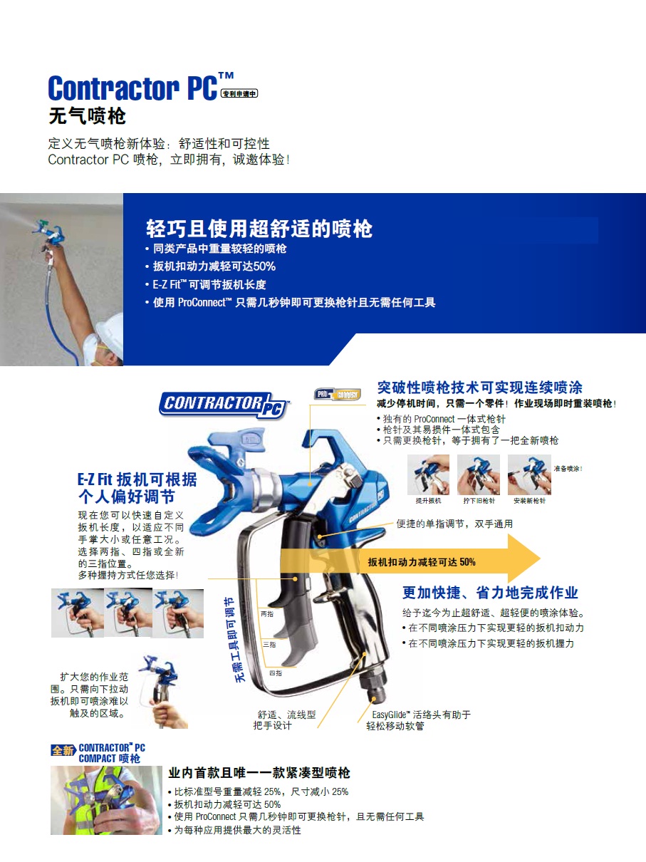 Contractor PC 无气喷枪是有史以来最轻便、最舒适的喷枪。 固瑞克独有的创新技术使 Contractor 喷枪具有全天候的舒适度和可控性,其耐用性得到现场验证,并且能够在作业现场快速组装。
