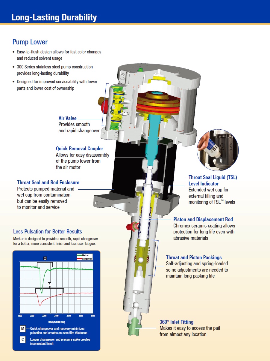 Merkur 低压柱塞泵可最大限度地减少脉动并最大限度地提高耐用性。先进的空气喷涂技术确保了一致的 A 级表面处理。这种喷漆机和泵套件为高粘度液体整理带来了卓越的性能。