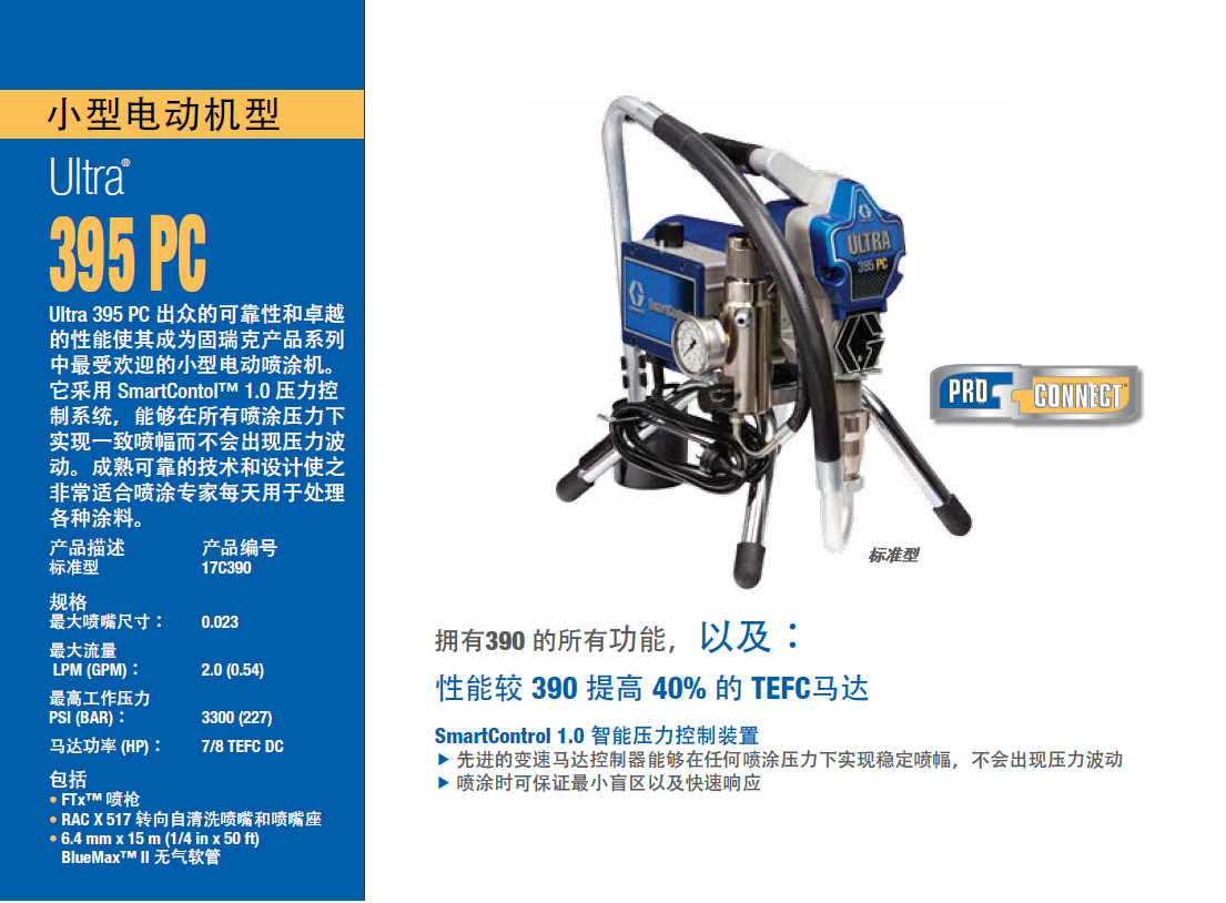 Ultra 395 PC 出众的可靠性和卓越的性能使其成为固瑞克产品系列中最受欢迎的小型电动喷涂机。它采用 SmartContol™ 1.0 压力控制系统,能够在所有喷涂压力下实现一致喷幅而不会出现压力波动。成熟可靠的技术和设计使之非常适合喷涂专家每天用于处理各种涂料。